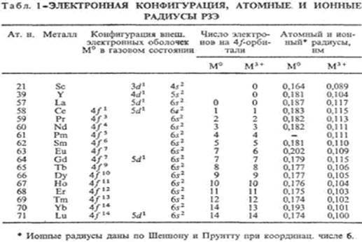 Электронная структура, лантаноидное сжатие, электронная конфигурация РЗЭ дана в табл. 1, у ионов М3+