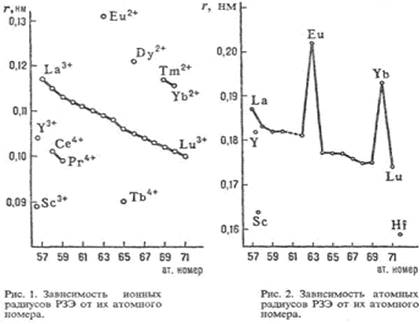 -уровень. С другой стороны, есть свойства, остающиеся примерно постоянными для всех РЗЭ. Вследствие лантаноидного сжатия при переходе от La к Lu ионные радиусы РЗЭ и их атомные радиусы (кроме Еu и Yb) плавно уменьшаются (рис. 1, 2), плотность простых веществ увеличивается [31].