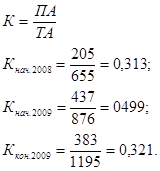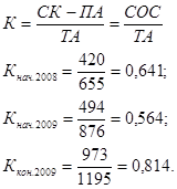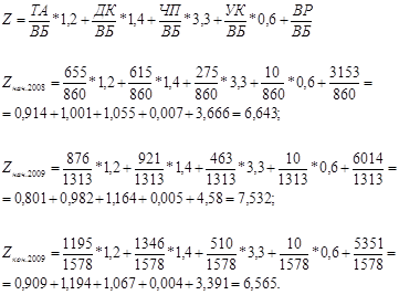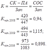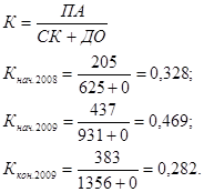 Из расчетов, приведенных в таблице 8, можно сделать вывод о высокой финансовой устойчивости анализируемого предприятия. Значение коэффициента Альтмана в данных расчетах принимает такое значение, что вероятность банкротства предприятия очень низка (она считается низкой при значении коэффициента ≥3). Также положительно работу предприятия характеризуют коэффициенты автономии, маневренности, обеспеченности собственными средствами. Коэффициент обеспеченности запасов собственными источниками приближен к 1, а на начало 2009 года превышает 1. Коэффициент соотношения заемных и собственных источников показывает, что предприятие вообще не прибегает к займам, лишь в начале 2008 года прибегло к заемным источникам, но величина займа была крайне мала. Коэффициент иммобилизации принимает довольно низкое значения, что отражает высокую степень ликвидности активов, это означает возможность предприятия отвечать по текущим обязательствам в будущем, только на начало 2009 года значение данного коэффициента приближено к 0,5, но к концу 2009 года оно снизилось до 0,321. Коэффициент обеспеченности долгосрочных инвестиций принимает достаточно низкое значение, что не лучшим образом характеризует финансовую устойчивость предприятия. Для финансово устойчивого предприятия коэффициент обеспеченности долгосрочных инвестиций должен быть больше 1.