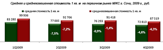 В конце 4 квартала 2009 г. средневзвешенная стоимость 1 кв. м на первичном рынке МЖС г. Сочи составила 86 821 руб. (min значение — 37 000 руб., max значение — 230 000 руб.), что ниже показателя, который был зафиксирован в конце 3 квартала 2009 г. на 4,7%, в начале 2009 г. (январь) - на 15,8%.