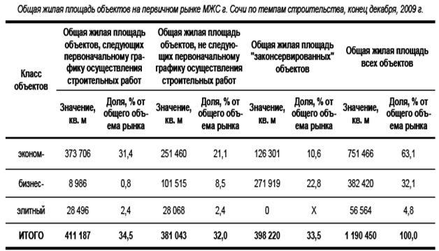 На первичном рынке МЖС г. Сочи элитный и бизнес– классы представлены небольшим числом проектов, что подтверждается их долями в общем объеме предложения — 4,8% и 32,1% соответственно. Эконом-класс, являющийся "основой" рынка, на сегодняшний день формирует 63,1% от общей жилой площади новостроек. Данный класс представлен не только крупными проектами, но и "клубными домами" (как правило, количество квартир в них — не более 50 ед., количество этажей — не более 5 ед.), что является отличительной особенностью первичного рынка МЖС г. Сочи в целом. В конце декабря 2009 г. клубные дома были представлены в количестве 28 ед. (25,9% от общего числа новостроек), общая жилая площадь которых составила 56 672 кв. м. (4,8% от общего объема рынка). "Клубные дома" являются особенностью эконом-класса г. Сочи.