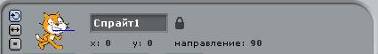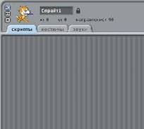 Верхнее поле содержит закладки (см. рис. 6), с помощью которых можно от просмотра скриптов перейти к просмотру возможных видов (рисунков) спрайта и связанных с данным спрайтом звуков. Краткая информация о выбранном спрайте: имя, текущий образ, координаты, направление и т.д. находятся выше (см. рис. 7).