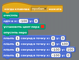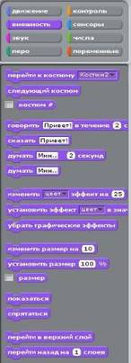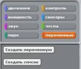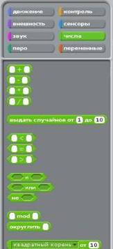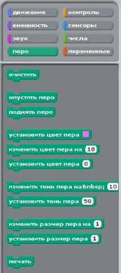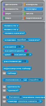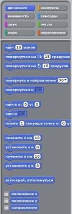 При создании скриптов используется палитра блоков, которая занимает левую часть экрана (см. рис. 8). В ее верхней части располагаются 8 разноцветных кнопок, которые выбирают нужную группу команд: движение (см. рис. 8), внешность (см. рис. 9), звук (см. рис. 10), перо (см. рис. 11), контроль (см. рис. 12), сенсоры (см. рис. 13), числа (см. рис. 14), переменные (см. рис. 15). Команды выбранной группы отображаются в нижней части выбранного окна.