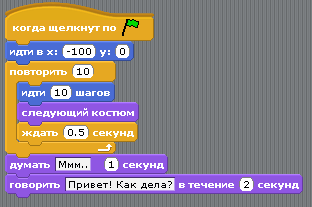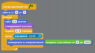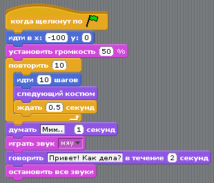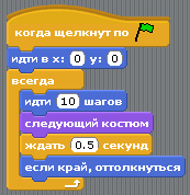 Листинг скрипта говорит о том, что спрайт при появлении начинает менять поочередно костюму, и когда одевает последний – исчезает. Получается красивый эффект ленты загрузки, реализованный самым простым способом.