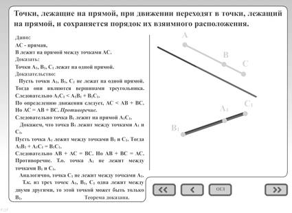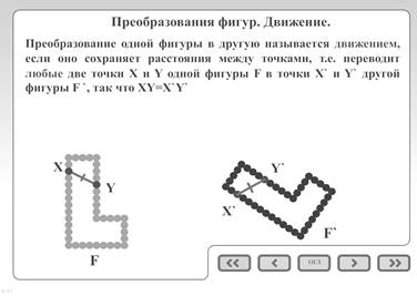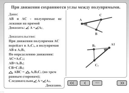 Остальные понятия, такие как сонаправленность полупрямых и равенство фигур, рекомендуется изучать классическим способом. Т.к. благодаря мультимедийному пособию ученикам уже известны основные свойства движений и они с помощью учителя без особых усилий смогут применить накопленные знания при изучении данных тем. Например, в теме «сонаправленность полупрямых» основным элементом является параллельный перенос, с которым ученики подробно ознакомились на предыдущих уроках, а в теме «равенство фигур» присутствуют все виды движений, с которыми ученики сталкивались. Перед изучением данной темы учеником рекомендуется повторить материал из сцены 12, которая содержит часть доказательства приведенной здесь теоремы.