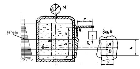 Прямоугольное отверстие высотой h= 300 мм и шириной b = 800 мм в вертикальной стенке заполненного водой закрытого резервуара закрыто щитком, вращающимся вокруг горизонтальной оси О (см. рис. 3). Щит прижимается грузом, подвешенным на рычаге длиной r = 1000 мм. Определить минимальный вес груза и построить эпюру давлений на щит, если известны глубина погружения нижней кромки отверстия под водой Н = 1000 мм, расстояние от верхней кромки отверстия до оси вращающегося щита а= 90 мм и показание пружинного манометра со