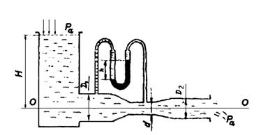 = 13 мм, в котором происходит увеличение скорости и понижение давления (см. рис. 7). Затем в диффузоре поток расширяется до диаметра d= 50 мм. Вода выходит в атмосферу на высоте Н2