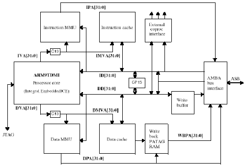 Блок-схема макроядра ARM920T представлена на Рис. 2.