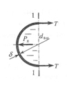 Эта сила уравновешивается двумя силами T, приложенными к стенкам трубы в местах условного разреза. Силу Т определяют из условия равновесия системы. Эти силы стремятся разорвать трубопровод по его образующей. Таким образом, стенки трубопровода работают на растяжение. Силу Т можно определить из уравнения прочности трубопровода, в которое входят размеры поперечного сечения стенки трубы и допустимое напряжение материала трубопровода [s]: