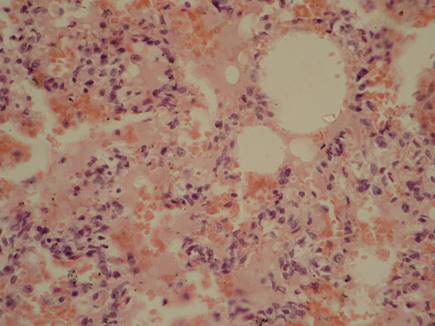 Рис. 1 - Легкие крысы при моделировании реперфузионного синдрома, отягощенного воздействием ионизирующего излучения, через 12 часов после снятия жгутов. Геморрагическая инфильтрация межальвеолярных перегородок и альвеол, интраальвеолярные геморрагии, интерстициальный и внутриальвеолярный отек. Окраска гематоксилином и эозином. Микрофотография. Ув. 200