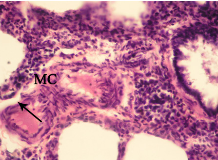 Рис. 2 - Легкие крысы при моделировании реперфузионного синдрома, отягощенного воздействием ионизирующего излучения, через 12 часов после снятия жгутов на фоне сочетанного применения корвитина и контрикала. Плазматизация микрососудов (МС), периваскулярный отек (стрелка). Окраска гематоксилином и эозином. Микрофотография. Ув. 100.