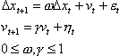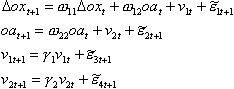 Модель описывает стохастический процесс для двух связанных между собой переменных: остаточной прибыли и информационной переменной, определяющей влияние существенных факторов не связанных с бухучетом (прибылью и т.д.). Модель представляет собой систему двух авторегрессионых AR(1) уравнений:
