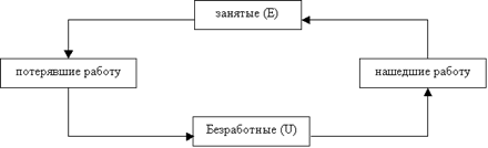 Для расчета естественного уровня безработицы может быть использована динамическая модель устойчивого уровня безработицы ("модель динамики рабочей силы"), предложенная М. Фридменом, который исходил из того, что основной причиной безработицы является несовершенство информации. Часть занятых теряет работу, становясь безработными, а часть безработных трудоустраиваются и становятся занятыми. Эти перемещения (потоки) изображены на рис.1.