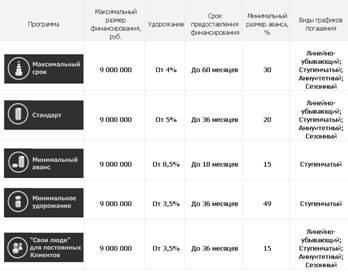 , компания постоянно разрабатывает специальные новые программы финансирования. Если какая-нибудь компания по продаже лизинговых услуг предоставляет потребителям эти услуги по единственной определённой схеме, например, предоставляя услуги строго до 36 месяцев, то компания «УРАЛСИБ» разработала, помимо стандартных, несколько программ с разными сроками предоставления финансирования, разным процентом аванса и т.д. И соответственно у неё будет больше клиентов (на рис. 8 представлены специальные программы финансирования с целью выбора наиболее удобного для покупателя варианта).
