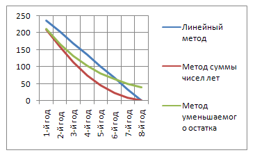 если первоначальная стоимость ОФ равна 270 млн. руб., амортизационный период составляет 8 лет, коэффициент ускорения равен 1,7.