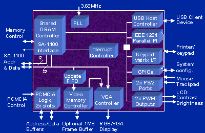 Высокая производительность микропроцессора SA-1100 обеспечивается высокой тактовой частотой и встроенными кэш большого объема, включающими кэш команд емкостью 16 Кбайт (Icache), кэш обратной записи данных (Dcache) и миникэш, обеспечивающими дополнительную гибкость при управлении перемещением данных. Встроенные буферы, модуль быстродействующего умножителя с функцией процессора цифрового сигнала (DSP) еще более расширяют полную производительность системы. К другим встроенным возможностям кристалла относятся: контроллер памяти, поддерживающий SRAM, DRAM, Flash, и ROM а также PCMCIA Типа 1 и 2; гибкий контроллер дисплея, поддерживающий монохромные и цветные дисплеи с разрешающей способностью до 1024x1024; пять последовательных и универсальных интерфейсов I/O, включая USB, кодек, IR, и SDLC; и все необходимые таймерные и системные функции.