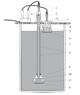 Прибор состоит из стакана емкостью 5 л, на раздвижной крышке которого укреплены два электродных блока (рис. 1). Анодный блок включает в себя верхнюю (2) и нижнюю (9) головки, которые соединены стеклянной трубкой (8). В корпусе верхней головки укреплены электроконтакт (1) и внутренняя трубка (8), в нижний конец которой впаян платиновый электрод (10). В корпусе головки имеются два отверстия (12), служащие для заполнения анодного пространства блока дистиллированной водой и выпуска газов, образующихся И. И. Никулин Рис. 1. Схема прибора для ускоренного осаждения глинистых частиц. Примечание: 1 – электроконтакты; 2 – верхняя головка анодного блока; 3 – катод ный блок; 4 – крышка; 5 – электрод; 6 – целлофановая пленка; 7 – стакан; 8 – стеклянные трубки; 9 – нижняя головка анодного блока; 10 – платиновый электрод; 11 – зажимное кольцо; 12 – отверстия для выпуска газов при электролизе. Нижняя головка анодного блока отделяет анодное пространство от суспензии без разрыва электрической цепи, что достигается с помощью целлофановой пленки (6), укрепленной в корпусе головки при помощи зажимного кольца