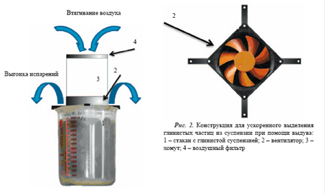 В центр накопительного стакана сверху подается поток воздуха, который посредством кондукции атмосферного воздуха с поверхностью глинистой суспеси ускорят процесс высушивания емкости. Физико-механические условия эффективности данного приема зависят от процесса влагопереноса – скорости потока и температуры окружающей среды [5]. Дополнительным условием является постоянное проветривание помещения. Данный прием принудительной сушки позволяет сократить время выделения сухой фракции мельче 0, 001 мм из суспензии до 1–2 дней.