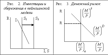 Графически соотношение инвестиций и сбережений в кейнсианской модели представлено на рис.2. Поскольку сбережения зависят от ставки процента, то их график представляет собой вертикальную кривую, а инвестиции слабо зависят от ставки процента, поэтому могут быть изображены кривой, имеющей небольшой отрицательный наклон. Если сбережения увеличиваются до S1, то равновесную ставку процента определить невозможно, так как кривая инвестиций I и новая кривая сбережений S2 не имеют точки пересечения в первом квадранте. Значит, равновесную ставку процента (Rе) следует искать на другом, а именно - на денежном рынке (по соотношению спроса на деньги МD и предложения денег МS) (рис. 3.)