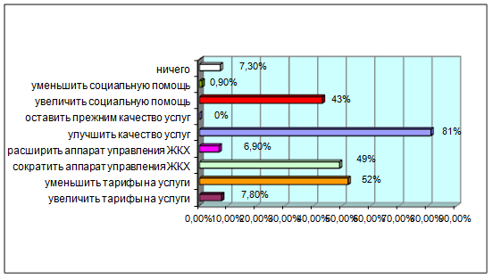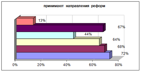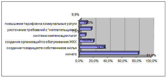 До начала реформы существовали и до сих пор существуют объективные и субъективные предпосылки, которые могли бы стать прочной основой положительного отношения населения к реформе. Прежде всего – это объективно плохое состояние жилищно-коммунального хозяйства, адекватная оценка населением существующего положения вещей в этой сфере, убежденность в необходимости преобразований. Однако в таких «Благоприятных» для начала реформы условиях начатая реформа встретила в целом негативную реакцию населения. На первом этапе реализации реформы не было предпринято никаких целенаправленных действий, чтобы, используя информационно-пропагандистские средства, сформировать «положительный» образ реформы. Как следствие – в условиях недоверия общества к любым реформистским начинаниям власти – новые планы были встречены негативно-настороженно. В сознании сложился однозначно-негативный образ реформы – как мероприятий по повышению тарифов, никак не связанных с улучшением качества коммунального обслуживания.
