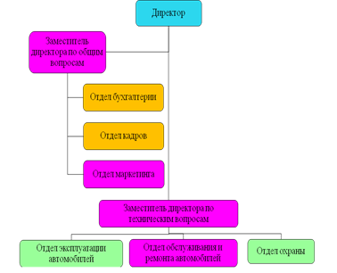 У директора имеетсядва заместителя. Первый является его помощником в вопросах касающихся финансов, кадров и маркетинга. Второй – подчиненным и решает задачи, поставленные руководителем, в отношении парка автомобилей, егообслуживания и ремонта.