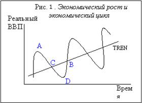 Каждая точка кривой, изображающей экономический рост (рис. 1), т.е. каждая точка на тренде соответствует величине потенциального ВВП или состоянию полной занятости ресурсов (точки В и С). А каждая точка на синусоиде, отображающей экономический цикл, соответствует величине фактического ВВП (точки А и D). Если фактический объем выпуска превышает потенциальный (точка А), т.е. фактический уровень безработицы ниже естественного уровня, то это означает, что совокупный спрос превышает совокупный выпуск. Это ситуация сверхзанятости. При переходе из точки В в точку А происходит рост уровня цен, т.е. ускорение инфляции. Таким образом, когда экономика находится на уровне потенциального выпуска (уровне полной занятости), что соответствует естественному уровню безработицы, инфляция не ускоряется.