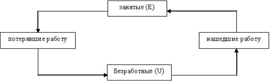 Для расчета естественного уровня безработицы может быть использована динамическая модель устойчивого уровня безработицы («модель динамики рабочей силы»), предложенная М. Фридманом, который исходил из того, что основной причиной безработицы является несовершенство информации. Часть занятых теряет работу, становясь безработными, а часть безработных трудоустраиваются и становятся занятыми. Эти перемещения (потоки) изображены на рис. 2.