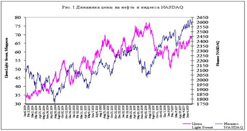 в январе, до $145/баррель к июлю. Начиная с середины июля, инвесторы вывели $39 млрд. с фьючерсного рынка, в то время как цена на нефть на Нью-йоркской товарной бирже откатилась ниже уровня $100/баррель. Все это происходило на фоне относительно стабильного состояния фундаментальных факторов. Еще один факт, показывающий взаимосвязь различных сегментов финансового рынка, - это сильнейшая взаимосвязь цен на нефть и валютной пары евро/доллар. Корреляция между этими двумя показателями на протяжении 2000-2007 гг. составляла 0,75, а в 2008 году еще усилилась. Также прослеживается сильная взаимосвязь цен на нефть и фондовых индексов. Так, к примеру, в период 2004-06 гг. наблюдалась сильнейшая отрицательная корреляция нефтяных котировок и американского фондового индекса NASDAQ, равная 0,9, которая, впрочем, иногда ослабевала. С начала 2007 г. по июнь 2008 г. рост нефтяных котировок совпадал с ростом экономических индикаторов (см. рис.2), а в 2008 г. корреляция вновь стала отрицательной. Это свидетельствует о неоднозначности взаимосвязи нефтяного рынка и экономики. Нефтяные котировки, особенно в последнее время, четко коррелируют с отношением пары евро/доллар (см. рис.3).