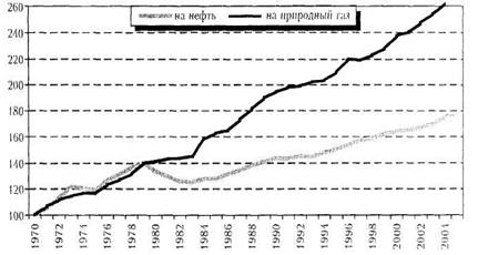(по сравнению с заложенными в базовый прогноз) спрос на нее снизится лишь на 15%. Тем не менее с учетом того, что мощностей НПЗ недостаточно для удовлетворения растущего спроса на топливо, он может начать постепенно переключаться на природный газ. Фактически это уже происходит: если темпы роста спроса на нефть составляли 1,5% в год в среднем за 2000-2004 гг., то спрос на природный газ увеличивался значительно быстрее - на 2,8% (см. рис.5).