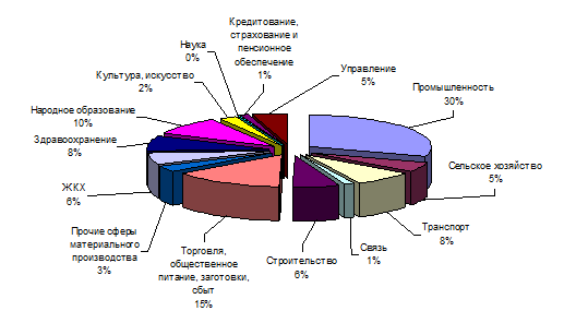 В 2000-2009 гг. произошел некоторый рост в отраслях непроизводственной сферы – на 2,6%. Продолжала снижаться численность работающих в промышленности и сельском хозяйстве, строительстве и науке. Возросла - в торговле, материально-техническом снабжении и сбыте, транспорте, кредитовании, культуре и искусстве, управлении.