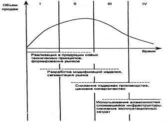 Для анализа положения изделия на рынке, оценки перспектив его сбыта, выбора стратегии продаж используется концепция "жизненного цикла товара". Стратегия производства в зависимости от стадии жизненного цикла товара показана на рис. 1.
