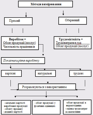 Схема 9.1.Методи вимірювання та показники рівня продуктивності праці