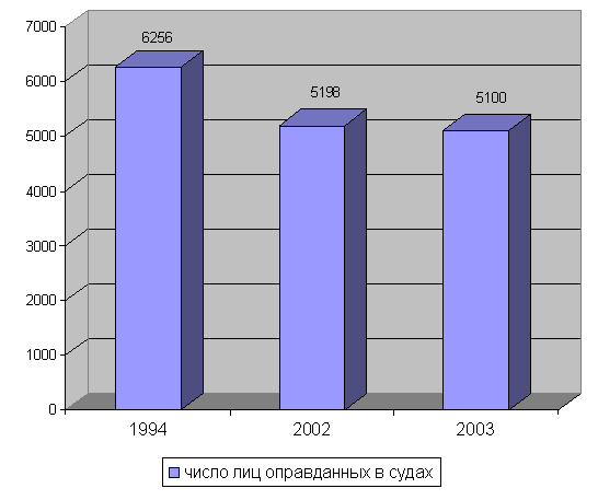 Однако, государство не имеет право на подобные ошибки, поэтому оно обязано минимизировать возможность подобных ошибок и злоупотреблений. В случае же их допущения - публично признать свою вину и незамедлительно предпринять все меры для реабилитации невиновного, и в процессе ее осуществления возместить вред, причиненный незаконными или необоснованными действиями правоохранительных либо судебных органов. Впервые в УПК РФ была введена глава 18 «Реабилитация», в которой законодатель определил основания, основные принципы и процессуальный порядок реализации данного института. Однако существующая судебная практика позволяет говорить о несовершенстве данного института. В Российской Федерации количество оправдательных приговоров составляет крайне незначительную часть от числа рассмотренных уголовных дел. В 2003 году судами общей юрисдикции рассмотрено по первой инстанции 970000 уголовных дел, что на 7,8% меньше, чем в 2002 году, а в 2004 рассмотрено 1043000 уголовных дел. Число лиц, в отношении которых по первой инстанции вынесены оправдательные приговоры, без учета дел частного обвинения, в 2003 году - 5100 человек, что на 1,9% меньше, чем в 2002 году, а за первое полугодие 2004 года - 2200 человек. Число лиц, в отношении которых были прекращены уголовные дела, составило 270000 человек, из них только в отношении 5% дела были прекращены по реабилитирующим основаниям (см. приложение 1).