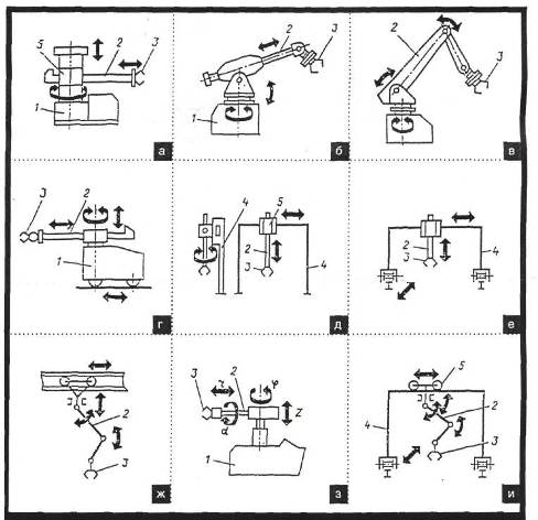 а) – с неподвижным основанием, вертикально перемещающейся кареткой и выдвижным манипулятором; б) – с неподвижным основанием и качающимся выдвижным манипулятором; в) - с неподвижным основанием и многозвенным манипулятором; г) – с подвижным (по полу или рельсам на полу) основанием, консолью и выдвижным манипулятором; д) портального типа с выдвижным манипулятором; е) – мостового типа с выдвижным манипулятором; ж) – портального и типа с многозвенным манипулятором; з) – с неподвижным основанием, консолью и выдвижным манипулятором; и) – мостового типа с многозвенным манипулятором (1 – основание; 2 – манипулятор; 3 – захват; 4 – опорная система; 5 – подвижная каретка).