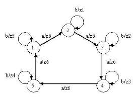 Граф, построенный в предыдущем пункте, не является полностью определенным, поскольку переходы под воздействием сигнала aне имеют выходных сигналов. Поэтому, составим схему конечного автомата.