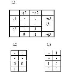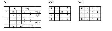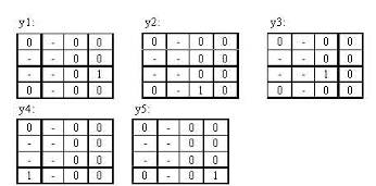 При помощи карт Карно построим и минимизируем функции Q1,Q2,Q3,y1,y2,y3,y4,y5 от аргументов x,q1,q2,q3, а также функции L1,L2,L3 от аргументов q1,q2,q3.