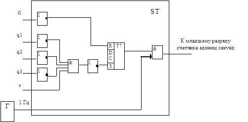 Принцип работы блока STследующий: если при корректировке минут была добавлена минута, то сигнал i1 сбросит триггер T7 в нулевое состояние, что не позволит пройти импульсам от генератора тактовых импульсов. Находиться в нулевом состоянии триггер T7 будет находиться до тех пор, пока на его вход sне подастся напряжение низкого уровня. Это произойдет, когда часы будут находиться в режиме отображении времени (q1=0 q2=0 q3=0) и будет нажата любая кнопка (нажатию кнопки соответствует появление синхроимпульса s, т.е. s=1).