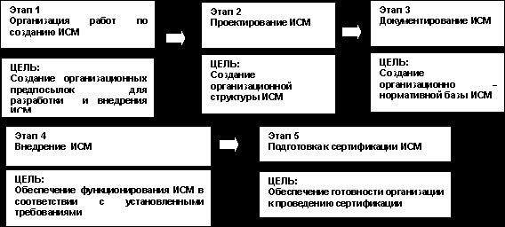 Порядок создания ИСМ может быть таким же, как и при создании СМК в соответствии с требованиями стандартов ИСО серии 9001. В общем случае этот порядок включает последовательное выполнение этапов, показанных на рисунке
