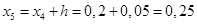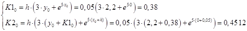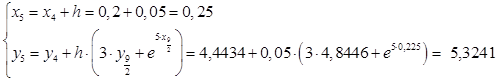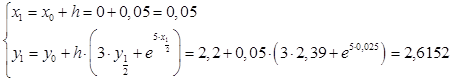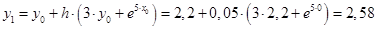 Решим дифференциальное уравнение первого порядка в интервале [0; 0,25] с шагом 0,05 и начальными условиями y(0) = 2,2