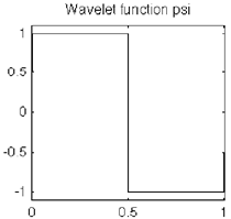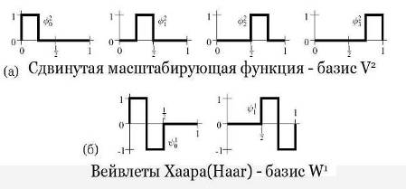 Теперь необходимо ввести некоторый базис для представления детализирующих коэффициентов. Такой базис был введен Хааром и его базисные функции, названные вейвлетами, изображены на рисунке 2.2 (б).