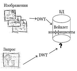 Другим применением дискретного вейвлет преобразования является поиск изображений по образцу. Рассмотрим в начале работу такой поисковой системы с точки зрения пользователя. Пусть существует некоторая база данных, в которой хранятся изображения. Задачи поиска изображений по образцу возникают либо когда у пользователя есть изображение плохого качества (например, отсканированное изображение с низким разрешением) и пользователь хочет найти это же изображение, но с более высоким разрешением или без дефектов, либо когда пользователь просто хочет найти изображение и способен нарисовать от руки его примерный эскиз.