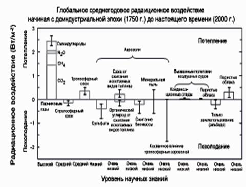- изменение энергетического, в частности теплового, баланса отдельных районов земного шара и всей планеты (выбросы тепла в результате сжигания топлива, ПГ и т. д.);