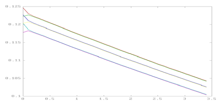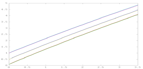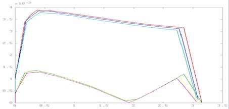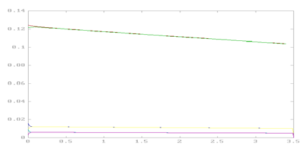 Видим, что при увеличении начального значения происходит лишь параллельный сдвиг решения, однако график ошибки перемещается в противоположную сторону (при увеличении начального значения она уменьшается и наоборот), причем непропорционально. Следовательно, при увеличении начального значения X ошибка уменьшается, однако с увеличением t это изменение становится все менее и менее заметным. Это характерно как для метода с переменным шагом, так и для метода с постоянным шагом. Кроме того, для метода с постоянным шагом увеличение шага приводит к уменьшению точности решения. Что касается жесткой системы, то для нее характерно прямолинейное конечное решение. С уменьшением шага ошибка, посчитанная по методу Рунге, уменьшается. При увеличении начального X происходит параллельный сдвиг графика конечного решения. Если в случае нежесткой системы графики решений разных составляющих X находятся далеко друг от друга, то при решении жесткой системы получаются очень близкие графики.