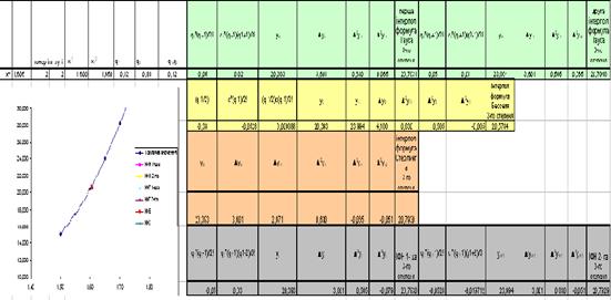 Покажемо працездатність програми на прикладі 1 (пункт 1.8.1). Для цього можна самостійно ввести всі необхідні дані або обрати в меню файл, як зазначалося вище, пункт «тестовий варіант». Як видно з результатів, отриманих при застосуванні програми (мал. 3), всі формули дають майже однакове наближення, окрім формули Бесселя (дану формулу краще використовувати при ). Особливо добре це видно з графіка. Тепер порівняємо отриманий результат із розрахунками, отриманими за допомогою електронної таблиці Excel (див. мал. 5).