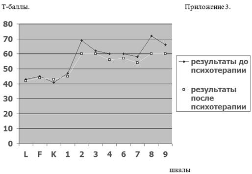 Результаты по методике MMPI до и после психотерапии у больных ишемической болезнью сердца.