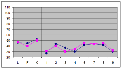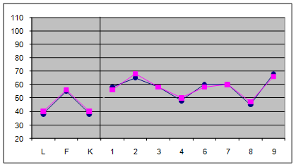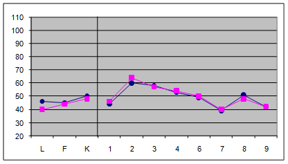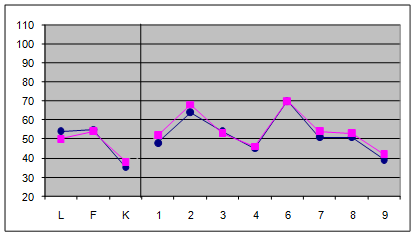 Снижение по 9 шкале говорит об особенно глубокой депрессивной окраске настроения. Повышение на общем фоне профиля 6 и 8 шкал может говорить о неявно выраженной агрессии по отношению к окружающим, обвинительной позиции, в то время как позиция других незначима. После проведения психотерапии наблюдается повышение профиля по 6 и 8 шкалам, в целом незначительные.