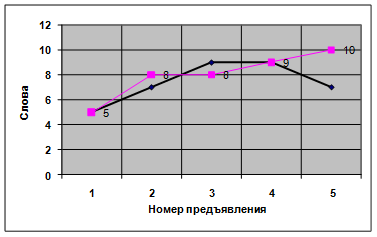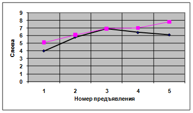«10 слов» - данные первого предъявления (нижний график) говорят об истощаемости, отвлекаемости (привнесение новых слов - лед, стук) и о дефицитарности объема актуальной информации, которая должна быть удержана.