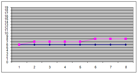 Методика “Таблицы Шульте” – время работы с таблицами при первичном исследовании от 50 до 115сек., при повторном – от 40 до 65сек. Изменение темпа сенсомоторных реакций в сторону ускорения, что говорит о повышении врабатываемости, повышение скорости переключения внимания, неравномерность распределения активного внимания без изменений.