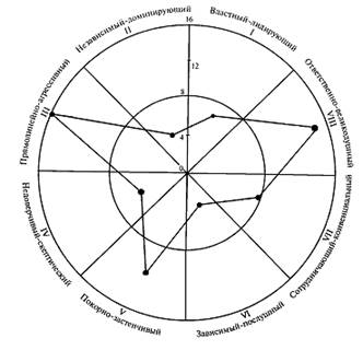 VIIIоктанта, преобладание которого позволяет отнести тип межличностного взаимодействия к «ответственному-великодушному», сочетается с такими личностными особенностями, как выраженная потребность в соответствии социальными нормам поведения, склонность к идеализации гармонии межличностных отношений, выраженная эмоциональная вовлеченность, которая может носить более поверхностный характер, чем это декларируется; тип восприятия и переработки информации художественный, стиль мышления – целостный, образный. Проблема подавленной (или вытесненной) враждебности, вызывающей повышенную напряженность, соматизация тревоги, склонность к психосоматическим заболеваниям; вегетативный дисбаланс как результат блокированности поведенческих реакций.