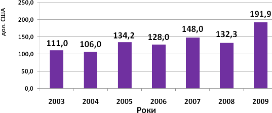 Рис.3.2 Обсяг прямих іноземних інвестицій на 1 мешканця області по рокам